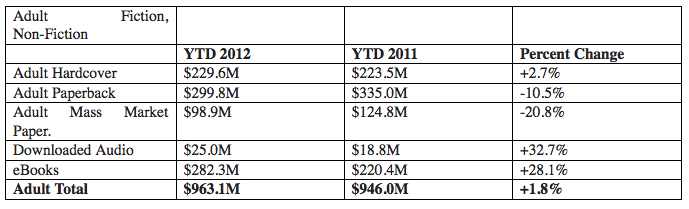 Volgens de Association of American Publishers is er in het eerste kwartaal van 2012 meer omzet in e-books gerealiseerd dan in hardcover-boeken, met een aandeel van 30% van de totale sales en een groei van 28%. Volgend kwartaal zullen e-books zelfs de grootste categorie zijn, want paperbacks hebben een 'voorsprong' van slechts 3% en daalden 10%. Over 2 à 3 jaar vormen e-books meer dan 50% van de omzet en nu al 40% van het volume.