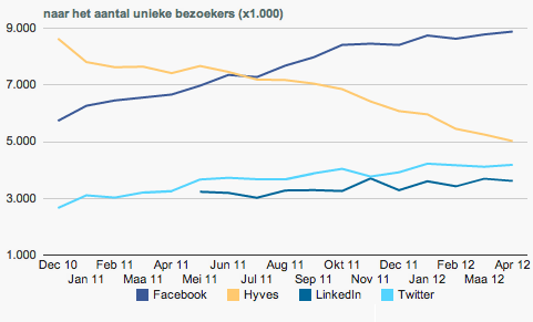 Kijk naar Hyves. Tot voor kort het grootste sociale netwerk van Nederland, nu langzaam aan het doodbloeden. Veel mensen zijn overgestapt op Facebook. Twitter en LinkedIn groeien nog steeds. Google timmert flink aan de weg met zijn eigen netwerk Google+. Dit blijkt uit de cijfers van Mei 2012: