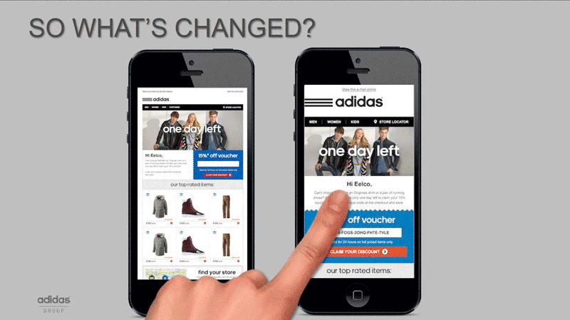 Als je e-mail responsive is, verandert alles per device: images, links, subjectlines en headers bijvoorbeeld. Dit betekent een heel andere belevenis per device. Door haar e-mails responsive te maken, is de click-through rate bij adidas met 30 procent omhoog gegaan en de opt-outrate is met 38 procent gedaald.