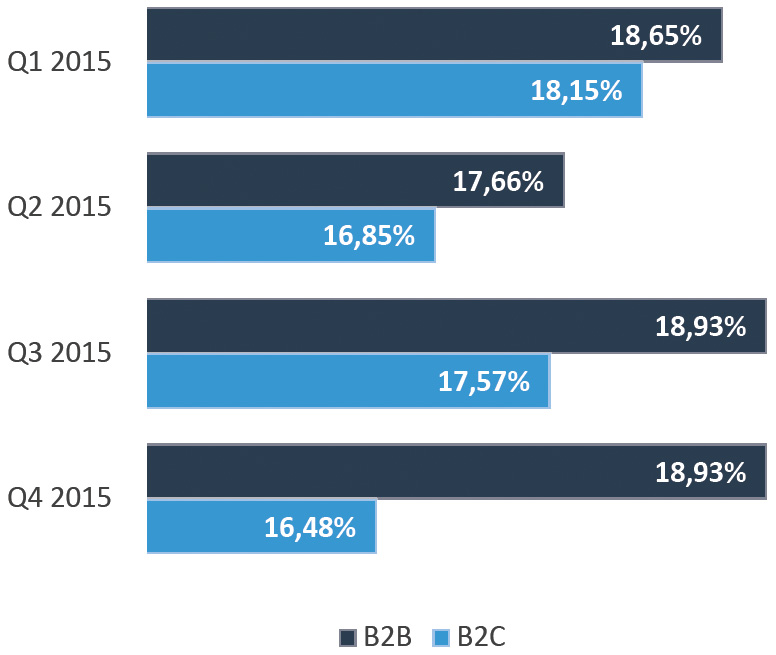 Tot slot zijn de percentages voor de click to open rate in b2b (gemiddeld 18,54 procent) hoger dan in b2c (gemiddeld 17,28 procent).