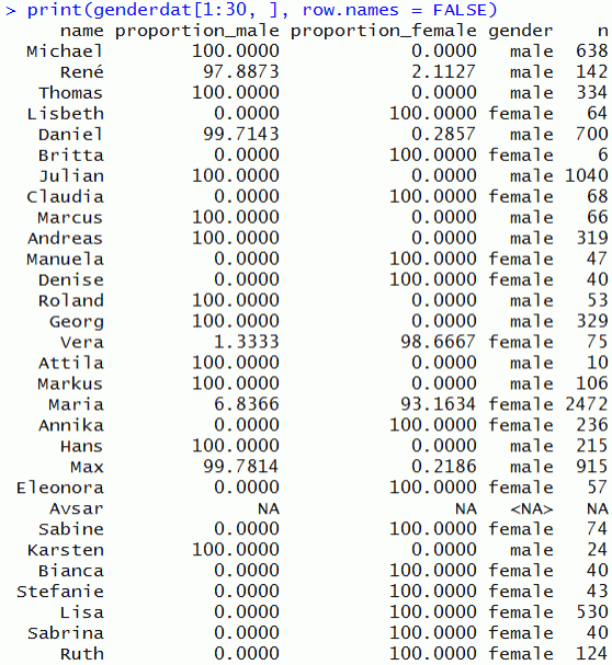 Het resultaat is natuurlijk niet perfect: 0,36 procent werd onjuist geclassificeerd en 96,01 procent correct, terwijl bij 3,62 procent over de naam niets bekend was (“NA”). Maar ondanks dat één onjuiste begroeting zwaarder weegt dan tien juiste, overtreft deze steekproef toch vele verwachtingen.
