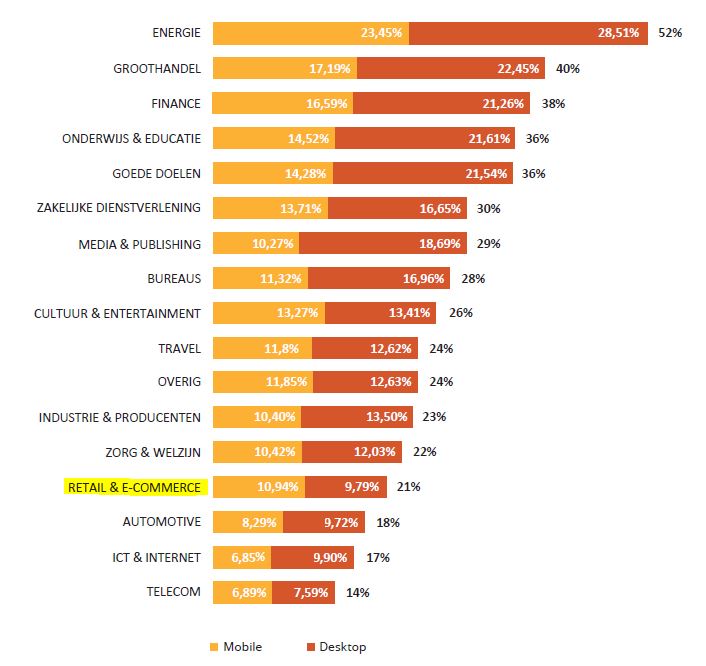 Net als voorgaande jaren blijkt ook uit de cijfers van dit jaar dat het met de databasekwaliteit in de retail- en e-commercesector wel goed zit. Met een bounce rate van 0,15 procent zit men zelfs ruim onder het jaargemiddelde van de gehele markt (0,28 procent). Maar deze goede afleverpercentages zijn helaas nog steeds geen garantie voor hoge open rates. Want met zo’n lage bounce rate zou je ruim boven de gemiddelde open ratio van alle sectoren (22,39 procent) kunnen scoren. Het tegenovergestelde is echter het geval. De retail- en e-commercesector heeft met 21 procent een van de laagste open rates.