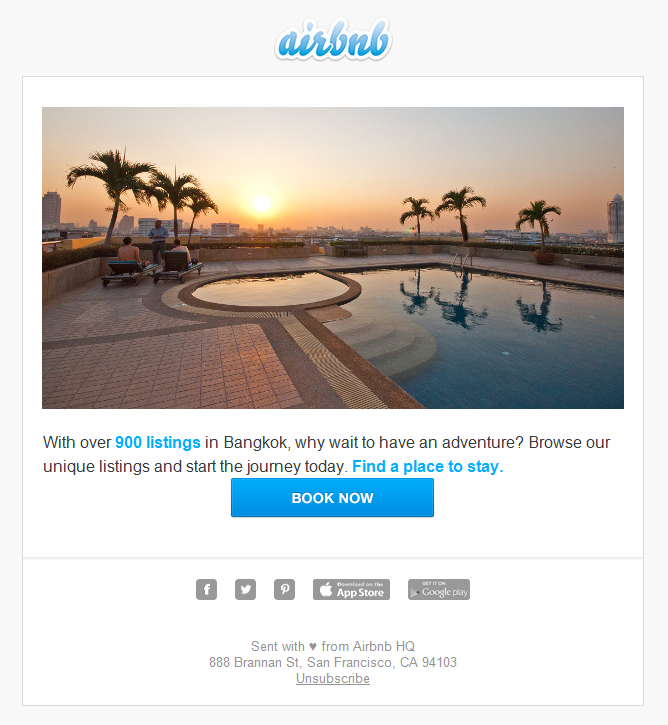 “Als promotioneel kanaal stelt e-mail ons in staat om onze klanten te inspireren en reisideeën of nieuwe, interessante bestemmingen naar de ontvangers te brengen.” Inspirationeel zijn de e-mails zeker. Bekijk het onderstaande voorbeeld, met onderwerpregel “Imagine yourself here”. Je kunt haast niet weerstaan om direct zelf op het viegtuig naar Bangkok te springen. De e-mail is heel eenvoudig, maar een plaatje van een dakterras met zwembad en een zonsondergang en 360-graden uitzicht over de stad zegt meer dan duizend woorden. Ze hebben natuurlijk ook een geweldige selectie boomhutten.