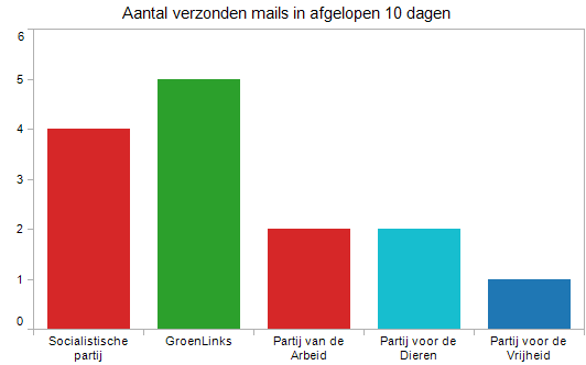 Effectiviteit: uiteindelijk versturen maar vijf partijen nieuwsbrieven. SP en GroenLinks spannen de kroon met respectievelijk vier en vijf nieuwsbrieven in de afgelopen tien dagen.