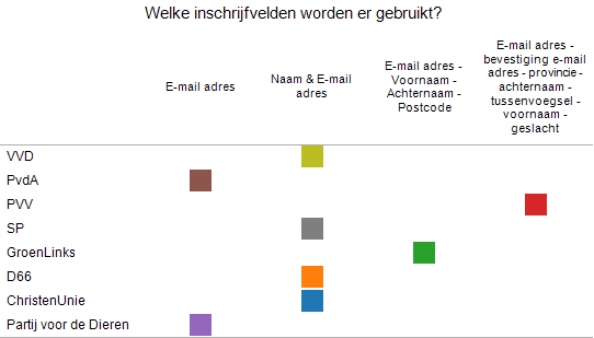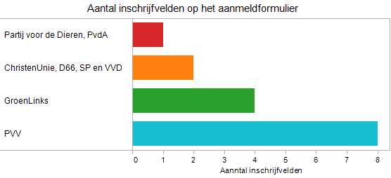 Aanmelding: je meldt je het snelst aan voor een nieuwsbrief van de PvdA en PvdD (die vragen enkel om een e-mailadres). De meeste tijd is een zwevende kiezer kwijt bij de PVV: maar liefst 8 velden moeten ingevuld worden.