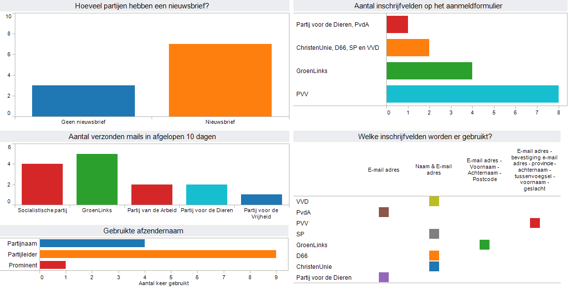Actief: zeven van de tien partijen zetten e-mailmarketing in. CDA heeft geen mogelijkheid tot inschrijven, VVD heeft geen nieuwsbrief, inschrijfveld van SGP werkt niet.