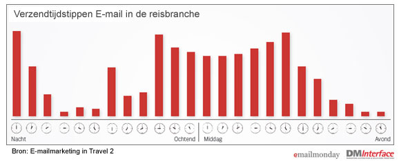 Het gemiddelde aantal e-mailings per verzender is flink toegenomen. In de onderzoeksperiode zijn per verzender 4,18 mails per maand verstuurd. Dat is 25% meer dan het jaar ervoor, toen verzonden de reisorganisaties gemiddeld 3,23 mails per maand. Er wordt vaker in de nacht verstuurd, tussen twaalf en een uur ’s nachts. Dit is nu het meest populaire verzendmoment. Ook in het weekend wordt vaker verzonden. In het vorige onderzoek werd 6% van de mails verzonden op zondag, waar dat nu 10% is.