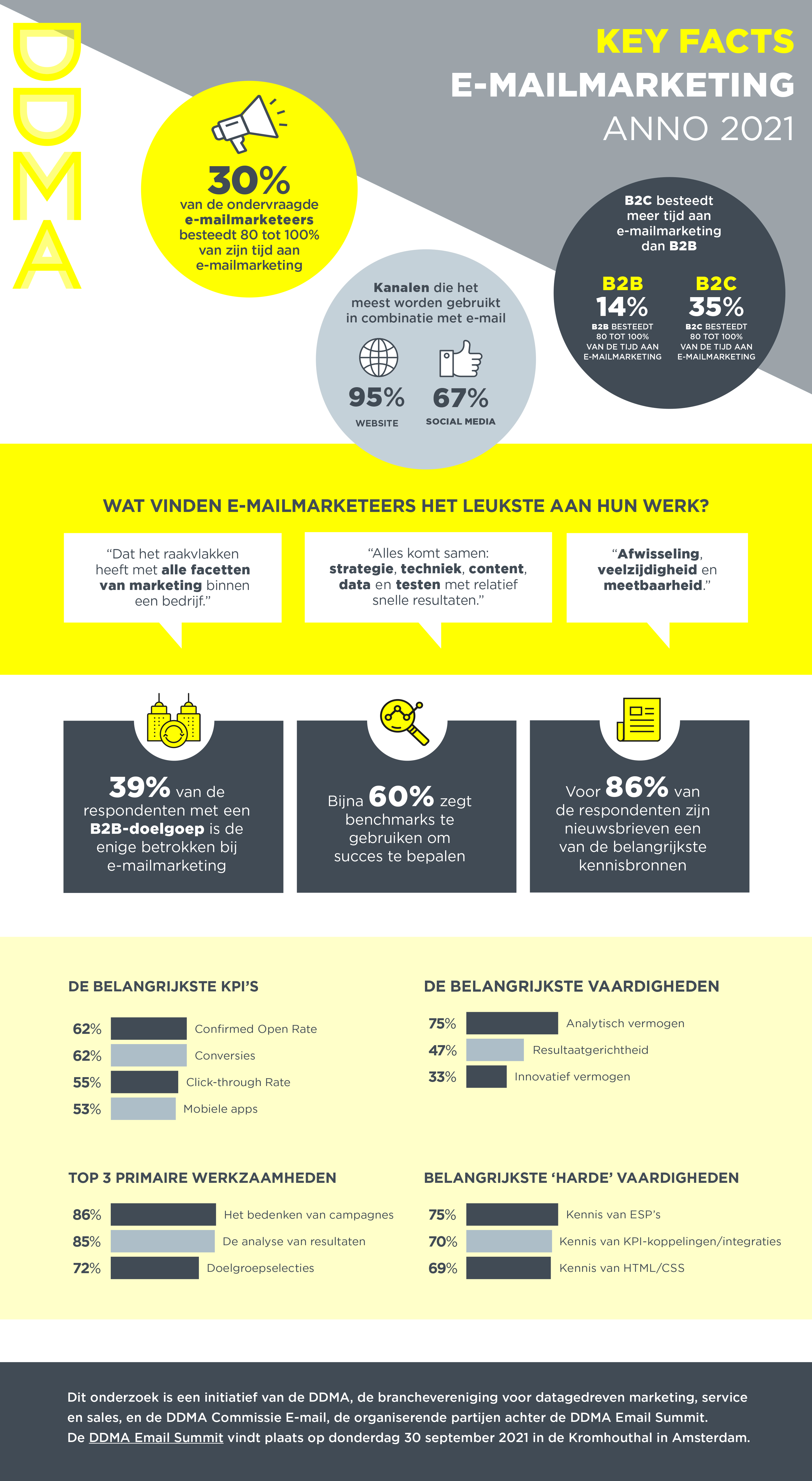 Werkzaamheden waar aanzienlijk minder tijd voor wordt vrijgemaakt zijn copywriting (50 procent), design (48 procent) en development (35 procent). Opvallend is dat respondenten binnen B2C-organisaties zich meer richten op techniek, bijvoorbeeld de technische inrichting van campagnes (81 procent). Bij B2B-organisaties scoort deze werkzaamheid met 57 procent aanzienlijk lager. Puur kijkend naar de ‘harde’ vaardigheden wordt kennis van ESP’s (75 procent), van KPI-koppelingen/integraties (70 procent) en HTML/CSS (69 procent) als belangrijkst beschouwd onder e-mailmarketeers.