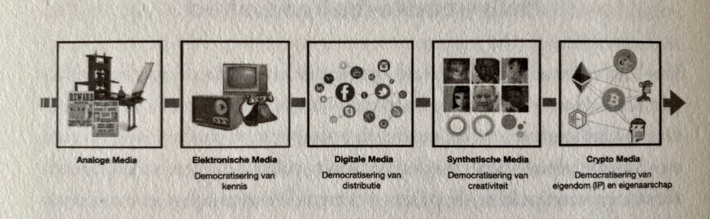 Het boek ‘Echt nep’ is een logisch vervolg op eerdere publicaties waarin de auteurs de media ontwikkelingen duiden. Na analoge media, elektronische media (democratisering van kennis) en digitale media (democaratisering van distributie) zien we nu met synthetische media (democratisering van creativiteit) en crypto media (democratisering van eigendom en eigenaarschap) de vierde en vijfde mediarevolutie: