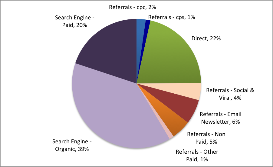 “Zoek machines heersen, sociale media niet”, zo concludeert het onderzoek. Meer dan 59% van al het online verkeer komt voort uit zoekmachines. Betaalde zoekverkeer zorgt gemiddeld voor 20% van het verkeer. Het directe verkeer is met 22% de derde bron van al het online verkeer. Email (6%) en Sociale & Virale (4%) marketing hebben een relatief klein aandeel in het trekken van bezoekers.