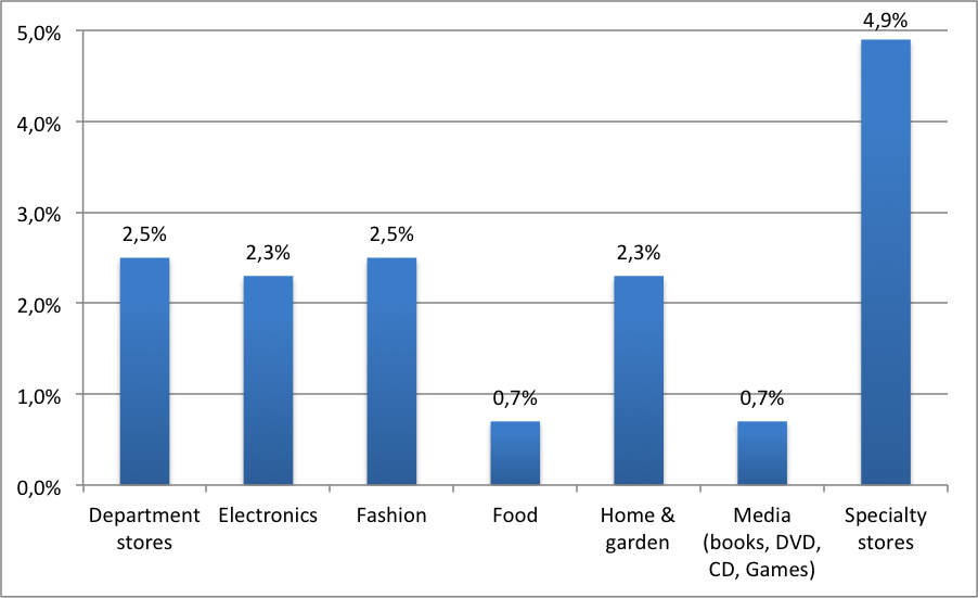 Van een schrale 0.7% in de food industrie tot 4.9% in gespecialiseerde online winkels kan worden afgeleid dat de conversie sterk verschilt per sub-industrie. Al hebben warenhuizen een breder assortiment en naar verwachting dus ook meer aankopen, toch is de conversie maar 2.5%. De specialist daarentegen behaalt online een voordeel met een conversie van 4.9%.