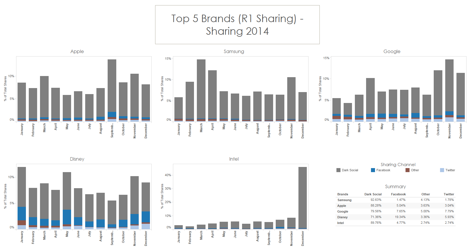 Inzoomend op die top-5, zie je voor 2014 duidelijk de verschillen per maand. Zo heeft Intel z’n plek in de top-5 volledig te danken aan een enorme hoeveelheid shares in december. En bij Apple zie je het effect van de lancering van de iPhone 6 in september terug in alle shares (ook openbaar), terwijl de verschillen bij Samsung vooral voortkomen uit dark social, dat verantwoordelijk is voor liefst 92 procent van alle shares over het merk.