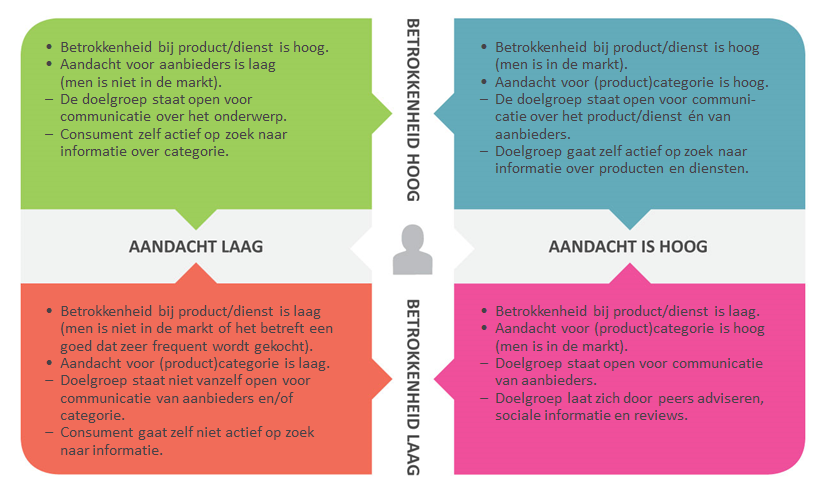 Klassiek voorbeeld is de persoon die op zoek is naar een nieuwe auto actief op internet zoekt, autobladen koopt en ineens overal interessante reclame voor auto’s ziet. Maar niet alle consumenten voelen zich even betrokken bij de aanschaf van producten. Wat voor de een high interest is, kan de ander amper schelen. Deze betrokkenheid is ook van groot belang hoe men met communicatie omgaat. Op basis van deze twee dimensies kunnen doelgroepen verder worden ingedeeld én gekwantificeerd. Zo ontstaat er een helder beeld over de omvang en potentie van elk doelgroepsegment.