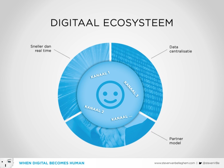 In het digitale ecosysteem staat de klant centraal. Dat vergt niet alleen een overstap van een kanaal- naar een klantgerichte organisatie. Het vraagt ook een grote mate van openheid ten opzichte van andere partners. Apple bouwt niet alle apps uit de App Store zelf. Het bedrijf zet zijn systeem open zodat anderen kunnen meesurfen op het concept. Hierdoor wint de consument, wint Apple zelf en winnen alle partners. Deze vormen van openheid ontwikkelt zich momenteel in meerdere sectoren.