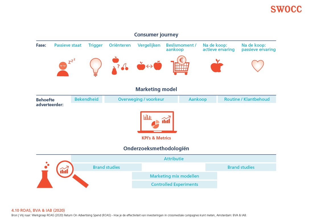 Het Return on Advertising Spend (ROAS) model van BVA en IAB helpt te bepalen welke doelstellingen, KPI’s en methodieken passen bij de verschillende fasen van de klantreis. Centraal staat het bepalen van de effectiviteit van reclame-inspanningen en hoe deze geoptimaliseerd kunnen worden. Hierbij is het de bedoeling dat de marketeer allereerst zelf per fase bepaalt wat de doelen zijn en wat gerealiseerd moet worden. Hierbij worden de volgende fasen onderscheiden: