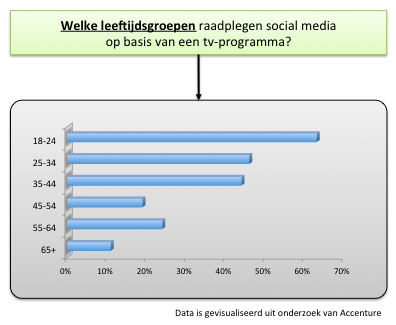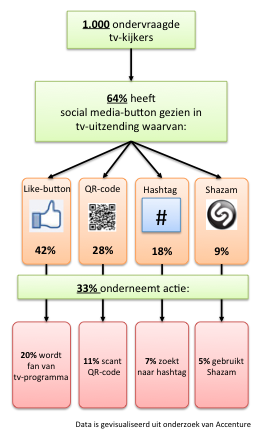 Wanneer we de uitkomsten van het onderzoek van Accenture visualiseren in een diagram, zien we dat de Like-button het meeste wordt herkend in een groep van duizend ondervraagde tv-kijkers. De Shazam-button wordt het minst vaak herkend. 33% onderneemt actie op basis van deze buttons. Wederom wordt op een Facebook Like-button het meeste gereageerd met als resultaat dat een tv-kijker middels Facebook fan wordt van het tv-programma. 11% scant een QR-code die in het programma wordt getoond en 7% zoekt in Twitter naar de vertoonde hashtag.