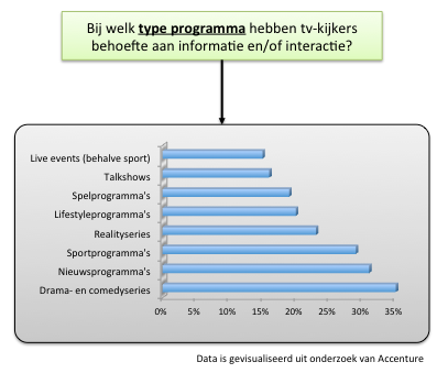 Dat de rol van social media bij het tv-format ‘The Voice Of Holland’ zichzelf heeft bewezen, is een feit. Helaas is niet ieder tv-programma in diezelfde mate geschikt hiervoor. De kwaliteit van content blijft de belangrijkste reden voor consumenten om met elkaar te delen. In het onderzoek van Accenture valt op dat een klein aandeel tv-kijkers hashtags onthoudt en actie onderneemt. Bij tv-programma’s met een wedstrijdelement dat mede wordt bepaald door het stemgedrag van de tv-kijker is naast het aantal kijkcijfers het aantal interacties in social media ook een belangrijke graadmeter. Dit geldt meer voor tv-programma’s waarbij de participatie van de kijker een rol speelt. Het programma ‘Holland’s Got Talent’ gebruikt bijvoorbeeld in de voorrondes voor iedere act een unieke hashtag, zodat meteen de sentimentwaarde van deze act kan worden gemeten. Eredivisie Live heeft in maart dit jaar ook een second screen-applicatie gelanceerd, waarover Rob de Bruyn al eerder een artikel heeft geschreven op Marketingfacts.