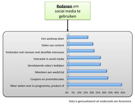 Een van de hoofdredenen om social media te gebruiken tijdens of op basis van een tv-programma is om meer te weten te komen over het programma. Coupons, promotiecodes, meedoen aan een wedstrijd en gerelateerde video’s bekijken komen respectievelijk op een tweede, derde en vierde plaats.