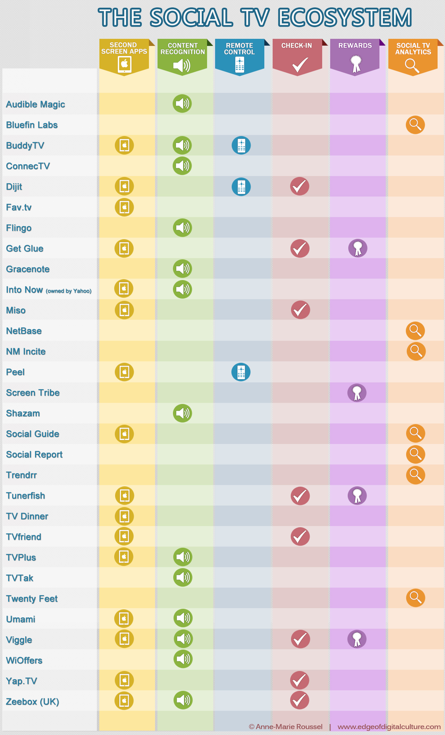 Vanuit Sharp Labs (Verenigde Staten) is getracht een social tv-ecosysteem te ontwerpen waarin second screen-apps zijn weergegeven (onderstaande afbeelding). GetGlue en Shazam gebruiken wij ook in Nederland. GetGlue is een typisch voorbeeld van een second screen-app. Deze app bindt zich niet aan een tv-programma, maar faciliteert slechts het delen van het kijkgedrag in social media.