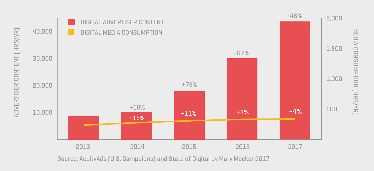 Teveel content voor onze aandacht. We spreken ook wel van een ‘content shock’: ook al besteden we meer aandacht aan merkboodschappen (+4%), we kunnen de toename in de hoeveelheid gedeelde content (+46%) simpelweg niet meer bijbenen: