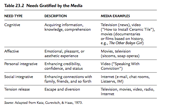 In 1973 werd door Katz, Gurevitch en Haas onderzocht welke menselijke behoeften vervuld worden met het gebruik van diverse media. Gebaseerd op de behoeften uit de Piramide van Maslov (1943) werd de volgende uiteenzetting van behoeften en mediagebruik ontwikkeld:
