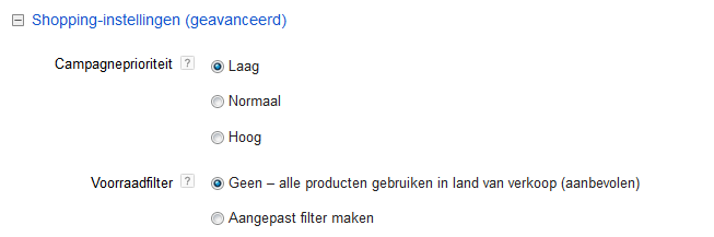 Onder de geavanceerde instellingen in het mogelijk om de campagne een prioriteit mee te geven door te kiezen voor laag, normaal of hoog. Een interessante instelling. Deze optie maakt het namelijk mogelijk om Google te vertellen welke campagne voorrang moet krijgen indien er een product in meerdere campagnes valt. Bijvoorbeeld: er is een ‘alle producten’-campagne (bod €0,50) en ‘lagemargeproducten’-campagne (bod €0,25). Bij de oude campagne zal de campagne ‘alle producten’ voorrang krijgen o.b.v. het bod. Met de prioriteitinstelling is het mogelijk om de ‘lagemargeproducten’-campagne voorrang te geven t.o.v. de ‘alle producten’-campagne.