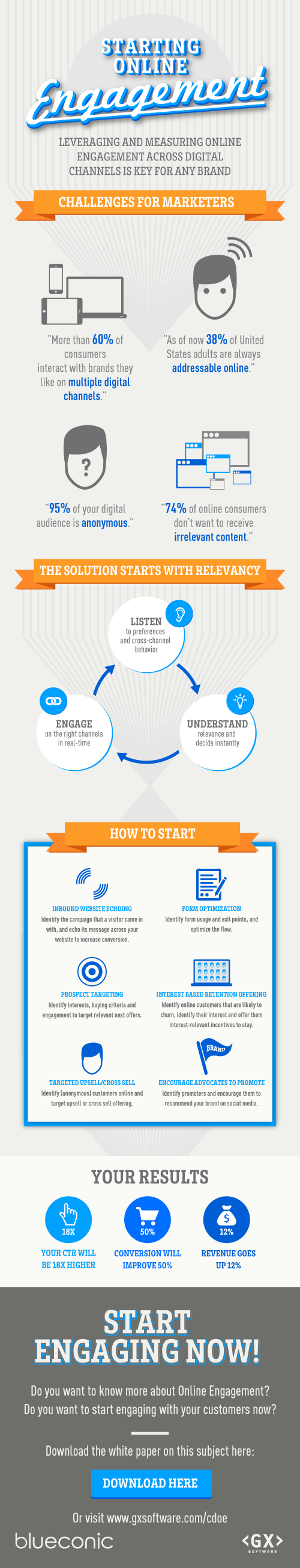 Klantcentraliteit is hard op weg het populairste onderwerp in marketing te worden. Op alle congressen en in alle blogs en vakbladen komt het terug. Veel marketeers in mijn omgeving zijn dit jaar dan ook van plan om ermee aan de slag te gaan. Toch kan klantcentraliteit, of zoals veel online marketeers het noemen ‘online engagement’, veelomvattend zijn. De vraag is dan vaak: hoe werkt online engagement? Wat is een goede eerste stap? En wat levert het op? Om daar een gefundeerd antwoord op te geven, heb ik in de afgelopen weken een inventarisatie gemaakt van cases die we bij GX Software in 2013 voorbij hebben zien komen. Op basis van een steekproef van 60 cases wil ik de belangrijkste inzichten met jullie delen.