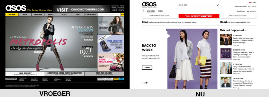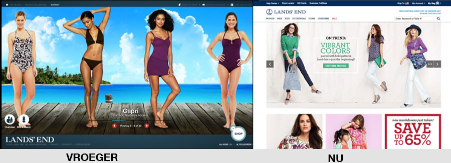Volgens Pieter schieten veel bedrijven meer en meer door in het design van hun webshop. Waren er vroeger nog allerlei verschillende gekleurde, mega-interactieve webshops, inmiddels is er na heel veel testen uit gekomen dat wit en clean gewoon werkt. Dit is goed te zien in voorbeelden van vroeger en nu van onder andere ASOS en Lands’ End.
