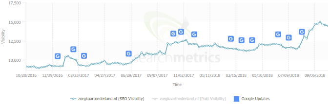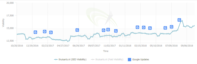 In de data van Search Metrics is inderdaad een stijging te zien in visibility (zie de afbeelding hieronder), maar er was al sprake van deze stijging nog voor de update. Of het inderdaad te maken heeft met de update is dus niet met zekerheid te zeggen. Enkele weken later is de visibility ook weer licht gedaald.