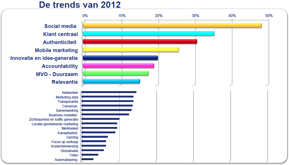Samen met ‘klant centraal’ en ‘authenticiteit’, wat vorig jaar de belangrijkste uitdaging was, vormen social media de toptrends in 2012. Veel marketeers gebruiken social media nog vooral om hun eigen boodschap te zenden. De dialoog blijft nog te vaak onbenut. Vooral marketeers in de industrie zeggen social media te gaan gebruiken vanwege de kostenvoordelen voor het marketingbudget.