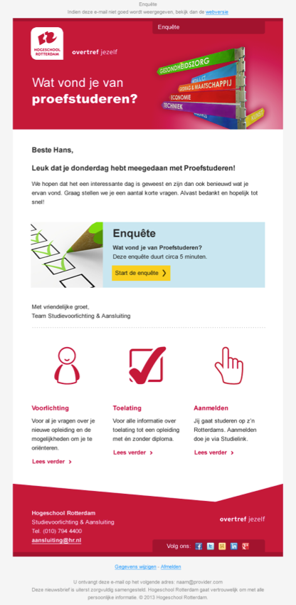 Dat segmentatie ertoe doet, zien we bijvoorbeeld bij Hogeschool Rotterdam. Deze stuurt onderstaande mailing naar studiekiezers die hebben deelgenomen aan een proefstudeerdag. Studiekiezers die zich wel hebben aangemeld, maar niet hebben deelgenomen, ontvangen deze e-mail niet; zij vallen buiten de segmentatie. De resultaten van een ingevulde enquête worden in de database bij het betreffende profiel weggeschreven. Op deze wijze wordt waardevolle informatie verzameld. Hogeschool Rotterdam leert de studiekiezer beter kennen en komt hun mening te weten over de proefstudeerdag.
