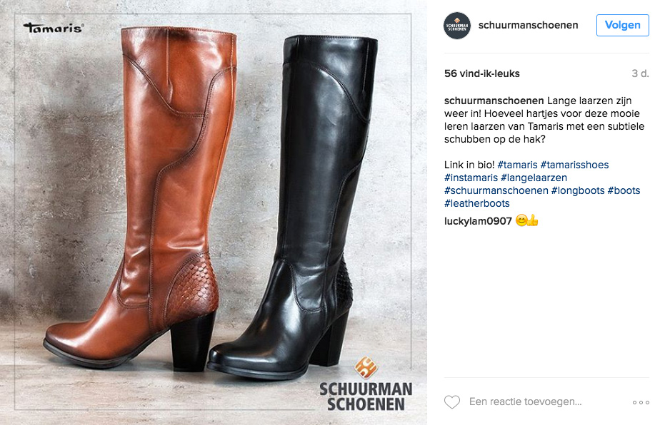 De enige plek waar een link te plaatsen is binnen Instagram, is in de biografie van je profiel. Een manier om toch naar het product in je post te linken, is deze plek te gebruiken. Na elke post pas je de link in de biografie aan en in de post verwijs je dan naar de ‘link in bio’. Schuurman Schoenen maakt hier bijvoorbeeld gebruik van.