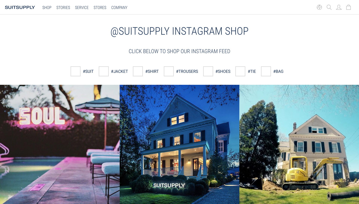 Een andere manier om jouw producten via Instagram aan de man te brengen, is het inrichten van een speciale landingspagina in jouw webshop. Op deze pagina worden alle producten getoond die op Instagram geplaatst zijn. De link naar deze ‘instashop’ wordt in de biografie gezet. Het voordeel is dat de link in de bio niet bij elke post hoeft te worden geüpdatet. Een goed voorbeeld van een bedrijf dat manier gebruikt, is Suitsupply.