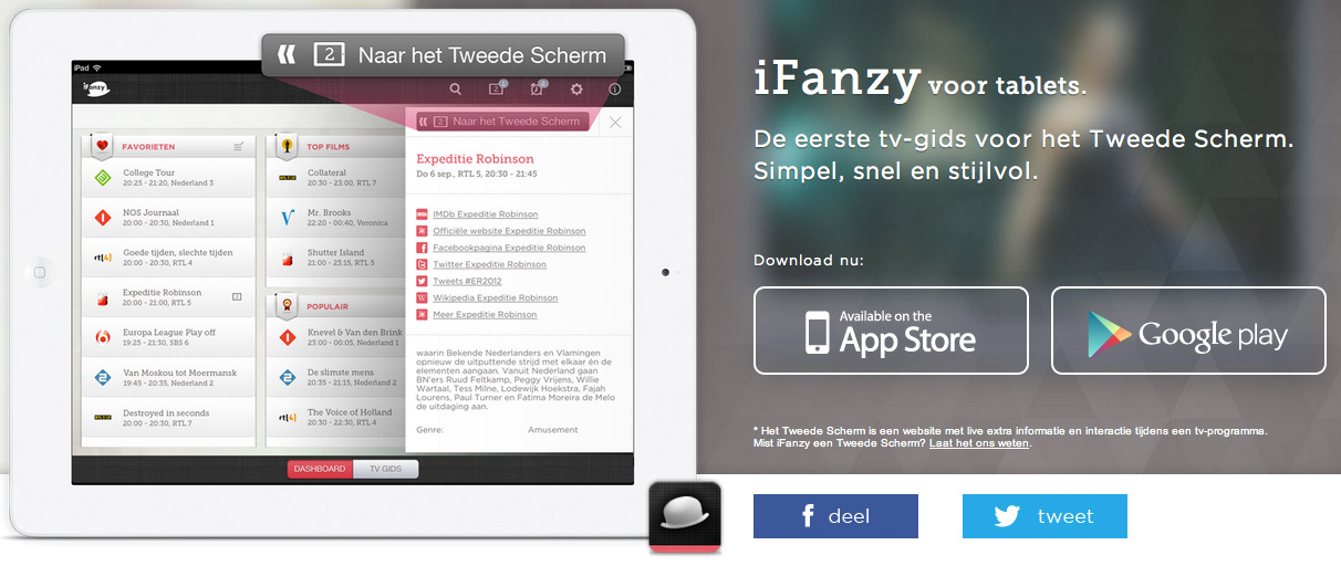 Zoals je van een electronische TV-gids kan verwachten, kent ook iFanzy een overzicht met programmainformatie (150+ zenders) tot 7 dagen vooruit, een zoekfunctie op programmatitel en een persoonlijk instelbaar dashboard met favoriete zenders. Daarnaast, als leuke bijkomstigheid, is iFanzy gratis (zonder login of registratie) te downloaden voor iPad– en Android-tablets. De iFanzy TV Gids is vanzelfsprekend niet de enige via internet beschikbare EPG, maar vooralsnog wel de enige die verrijkt is met second screen-informatie.