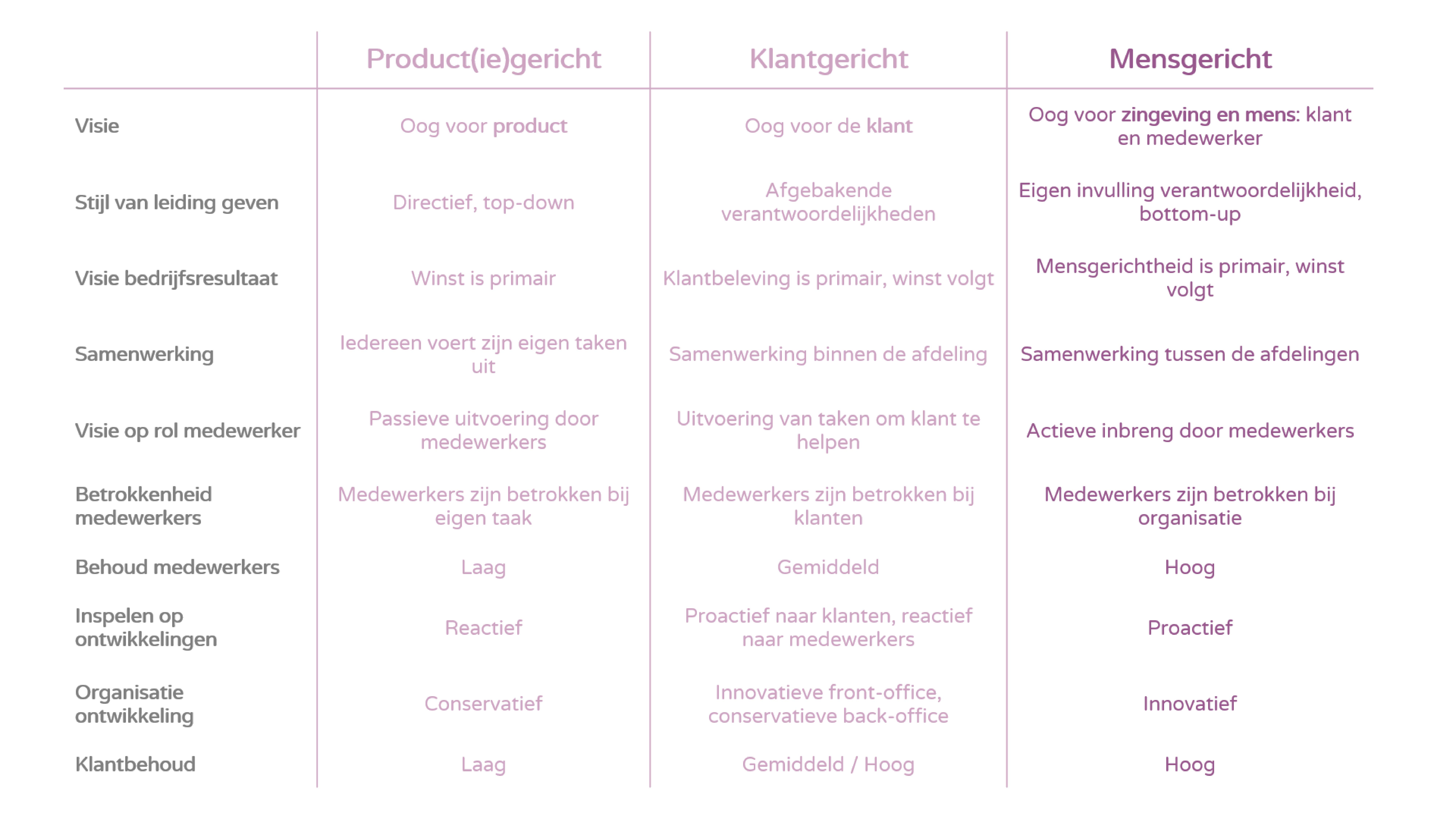 Kijk maar eens naar deze tabel waar ik een product-, klant- en mensgerichte organisatie met elkaar vergelijk.