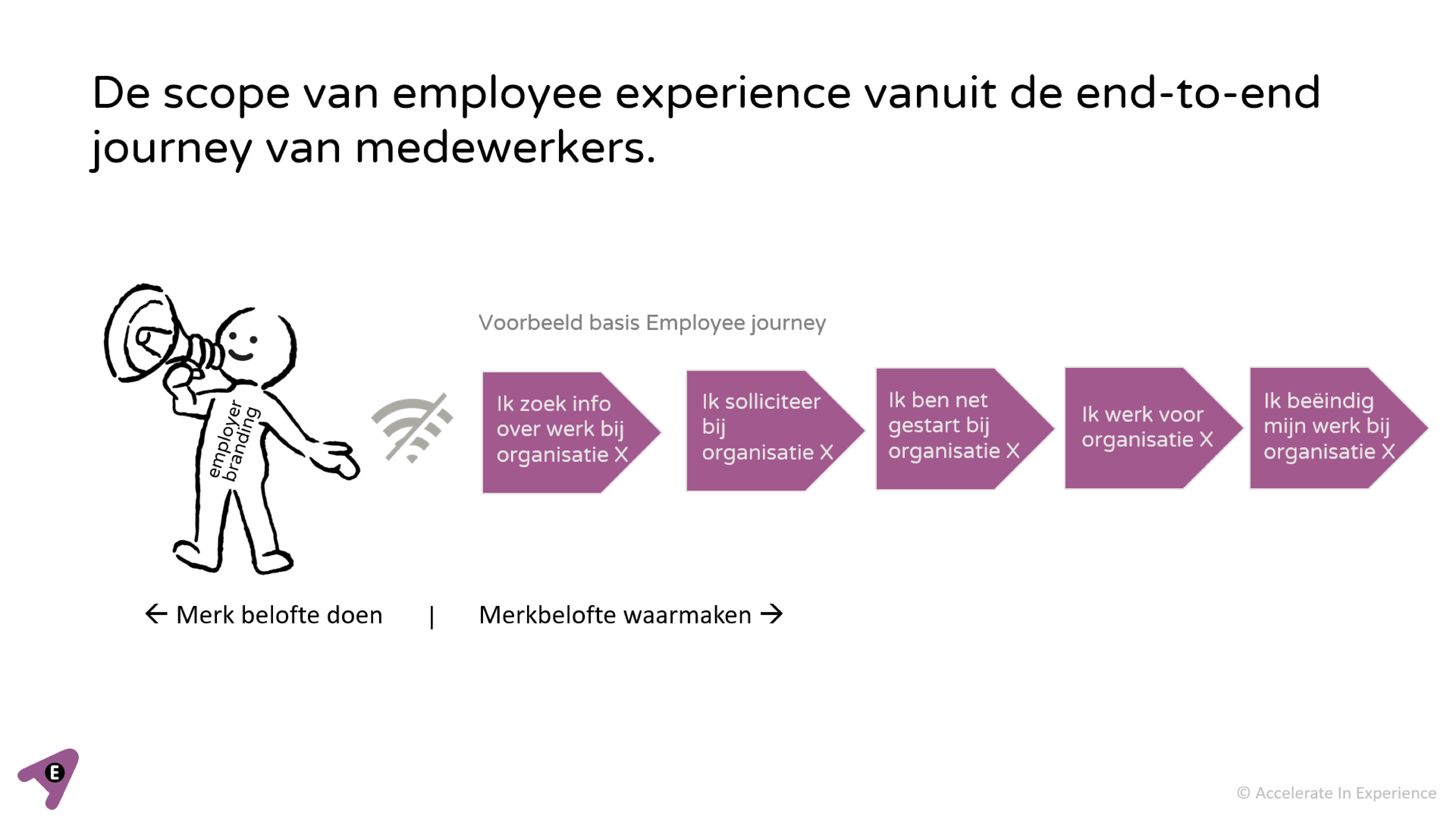 Dus vanaf het moment dat een recruiter mij benadert, of ik de website met vacatures bekijk tot en met het in dienst treden en uiteindelijk weer vertrekken, is de scope van employee experience.