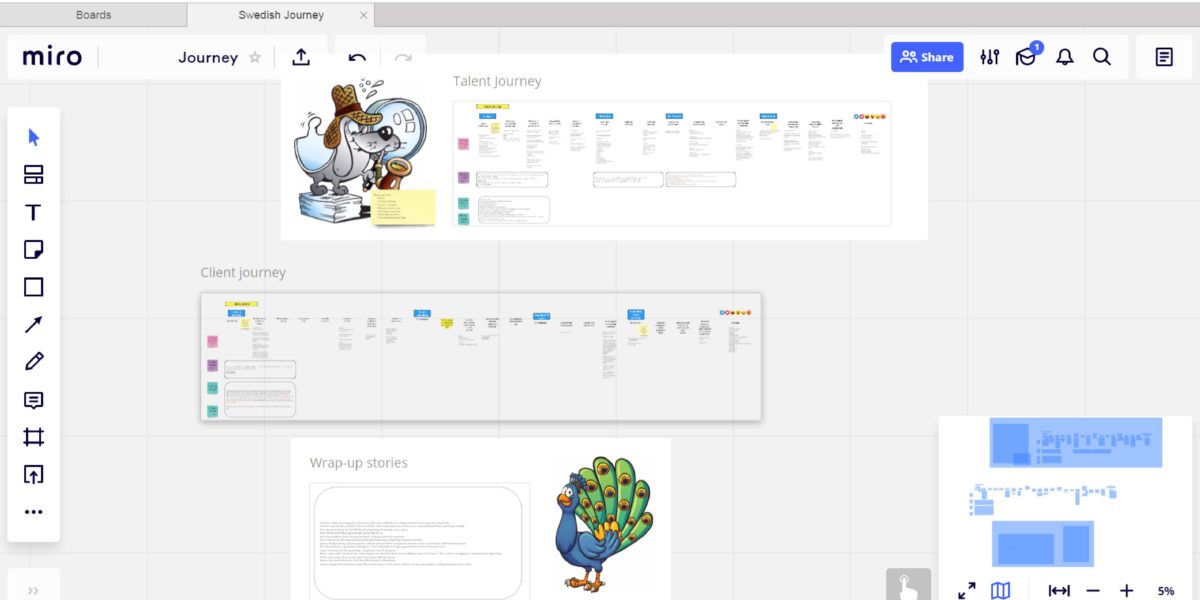 Ik had nog nooit virtuele journey-workshops gedaan, maar wel al jaren ervaring met live-workshops. Vertrouw gewoon op je niet-virtuele ervaring en wees niet bang om fouten te maken (denk aan het per ongeluk verschuiven van elementen op het board, waardoor mijn collega niet meer wist waar ze zat (ja, er is een lock-optie, weten we nu!) of mensen die op mijn vraag met hun hoofd knikken, terwijl ik ze niet zie).