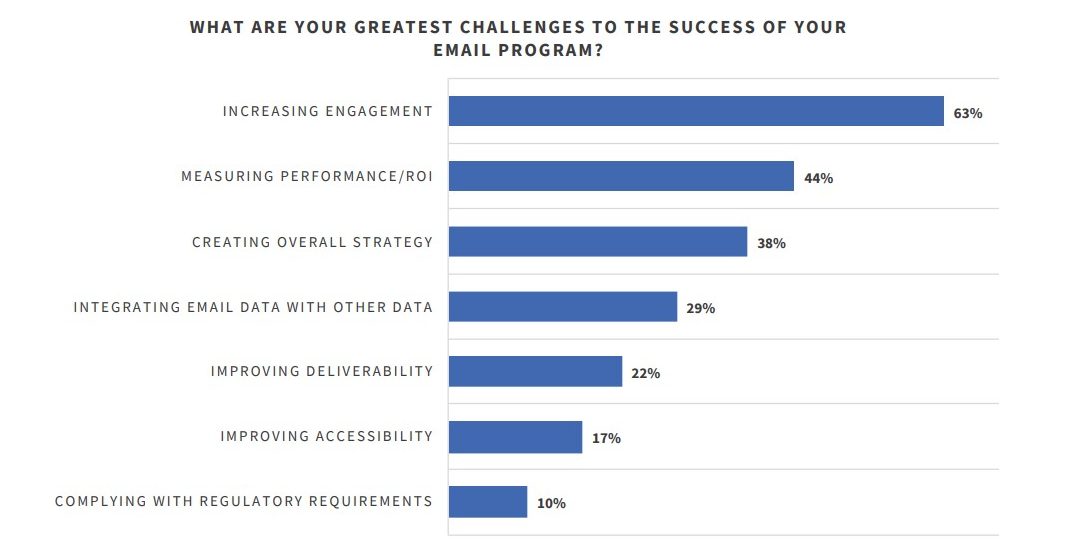 De grootste uitdaging die e-mailsucces in de weg staat, is het vergroten van de engagement, volgens 63% van de respondenten. Het meten van prestaties en ROI wordt ook vermeld als een topuitdaging voor succes door 44% van de ondervraagde marketingprofessionals. Helemaal onderaan het lijstje vinden we het naleven van regelgeving. Het creëren van een strategie staat ook hoog (met 38%) en dat is eigenlijk ook best opvallend als je denkt aan de volwassenheid van het kanaal.