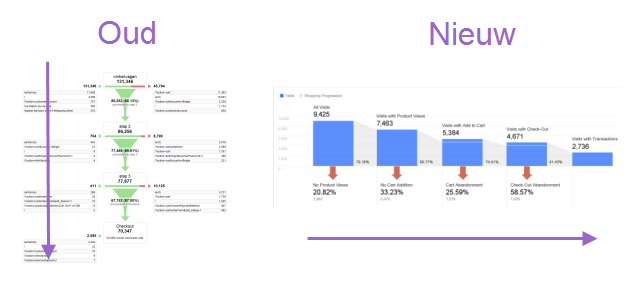 Om te beginnen is de weergave van de stappen van je betaalproces compleet gewijzigd. In het verleden maakte iedereen altijd een goal funnel aan om te kunnen zien in welke stap van het betaalproces de meeste bezoekers afhaken (trechterweergave). Bij de nieuwe Enhanced Ecommerce-rapportages is deze weergave voortaan gekanteld (watervalweergave):