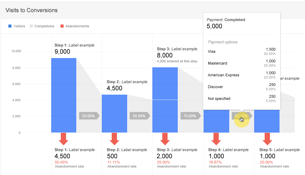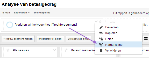 Per stap/transitie kan je daarbij ook extra kenmerken meegeven, zoals bijvoorbeeld de gekozen betaalmethoden (zie de afbeelding hierboven), of de keuze wel/niet inloggen. Daarnaast kan je ook heel eenvoudig vanuit de waterval een segment creëren van bijvoorbeeld de verlaters van je winkelwagen. Dit segment kan je vervolgens weer gebruiken voor een remarketing-lijst – mits je bezoeker hier uiteraard toestemming voor heeft gegeven!