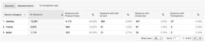 Daarnaast bieden beide watervalrapportages ook een tabelweergave waarin de verschillende stappen kunnen worden geanalyseerd op basis van een bepaalde dimensie (bijvoorbeeld apparaatcategorie of bron/medium):