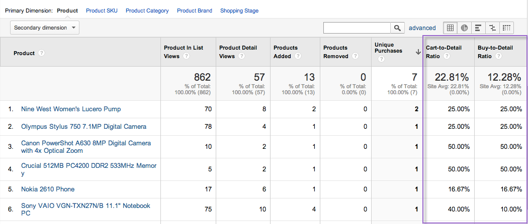 Net zoals in de oude ecommerce-rapportages kun je bij enhanced ecommerce zien wat de meest verkochte producten zijn. De nieuwe rapportages bieden nu echter ook inzicht in hoe vaak iedere productdetailpagina is bekeken en hoe vaak een bepaald product is toegevoegd aan de winkelwagen. In de productprestaties-tabel krijg je hierdoor op productdetailniveau inzicht in de 'add-to-cart ratio' en de 'look-to-book ratio':