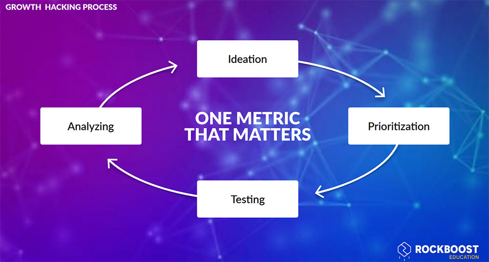 Maar hoe hack je nou e-mailmarketing? Eerst begin je met het kiezen van een groeidoel. Wil je sales laten groeien? Of je database? Of je omzet? Kies er eentje. Vervolgens moet je de volgende stappen constant herhalen totdat het proces geoptimaliseerd is.
