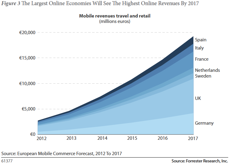 Met deze enorme groei zal mobile commerce tegen 2017 6.8% uitmaken van de totale online retail omzet. Duitsland kent een hoge groei, maar dit komt voornamelijk door de relatief lage smartphonepenetratie op dit moment. Met 5,7% in 2017 heeft Duitsland het laagste aandeel van mobile commerce t.o.v. de totale retailomzet. Naast de lage adoptie van smartphone speelt ook mee dat nog maar weinig retailers hun website voor mobiel hebben geoptimaliseerd, hoewel dit ook een kip en ei verhaal is. Hetzelfde geldt voor Zuid-Europa, ook die landen kennen een sterke groei, maar in absolute aantallen zijn de cijfers voor 2017 relatief laag. Desalniettemin zal een lage penetratie van breedbandinternet ervoor zorgen dat veel Zuid-Europeanen mobile first georiënteerd zijn.