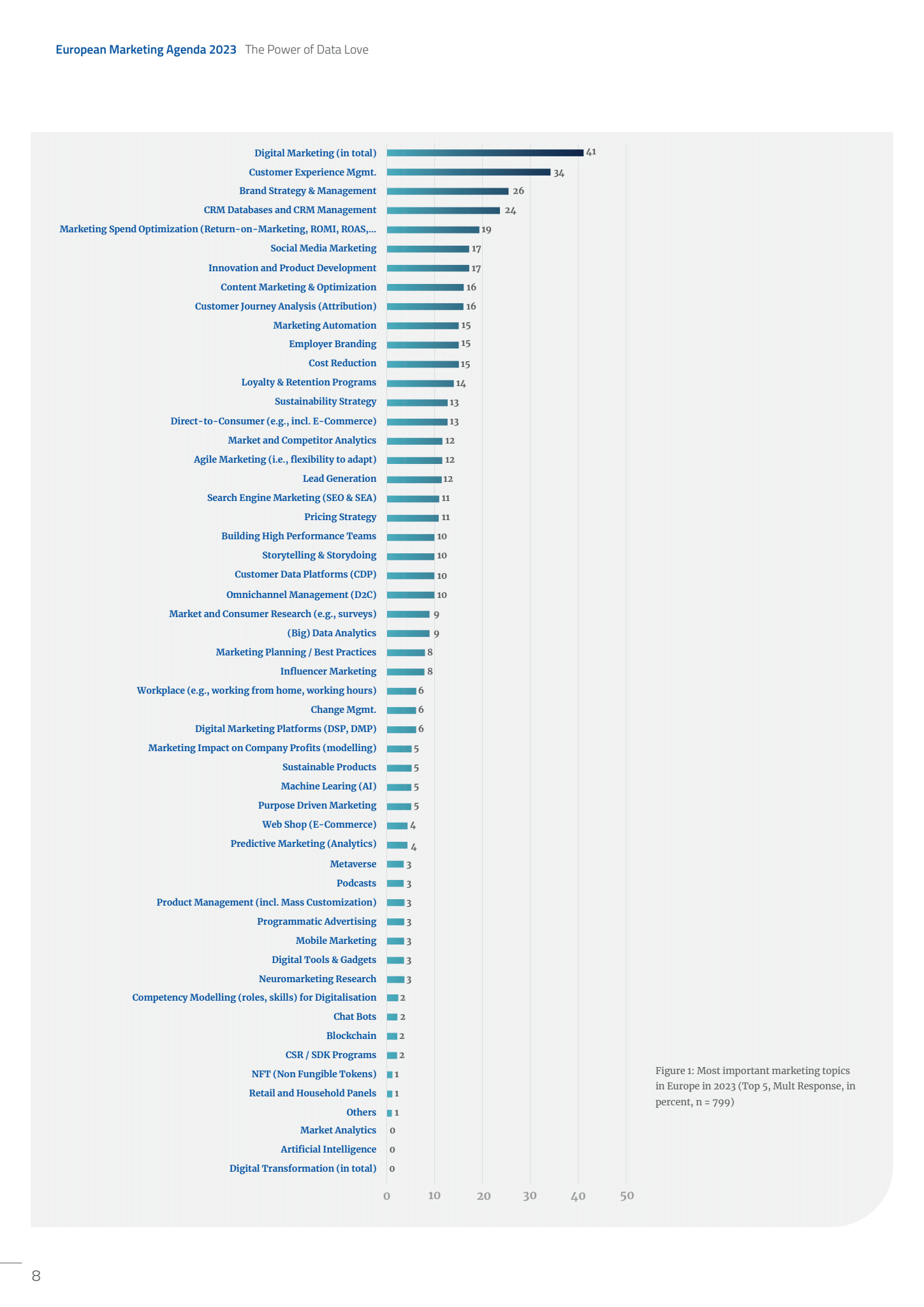Het onderzoek kreeg als ondertitel ‘The power of data love mee’. Digitalisering is al een aantal jaar hét thema van dit onderzoek al is het eigenlijk interessanter om juist te kijken naar onderdelen die niet over gebruik en inzet van data en martech gaan, want we geloven direct dat ‘first party data’ de gemoederen bezighoudt van Lissabon tot Kopenhagen, maar dat ‘customer experience management’ de nummer twee op de lijst is, verraadt wel dat er bovengemiddeld veel B2B en serviceverleners tussen de respondenten zitten. En dus niet zoveel FMCG en retail.