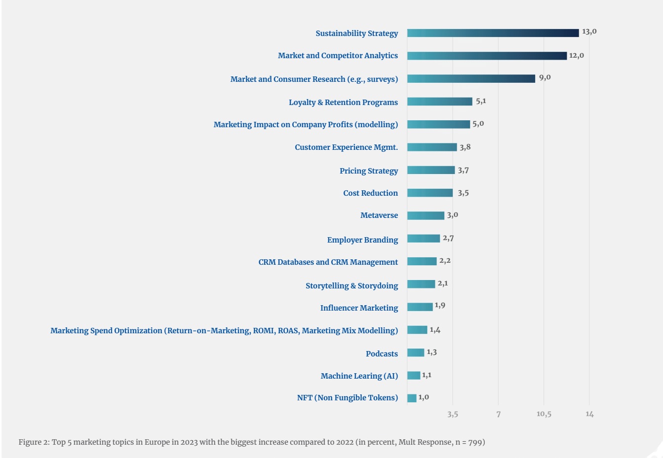 Staatje dat we er zeker ook uit willen lichten is het verschil tussen vorig jaar en dit jaar. De Top 5 marketing topics in Europe in 2023 with the biggest increase compared to 2022.