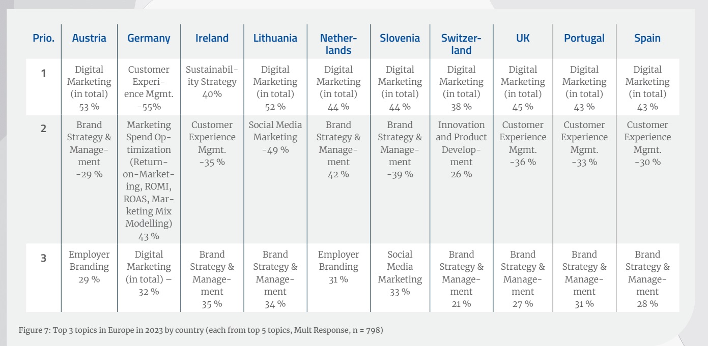 Tot slot misschien wel de allermooiste om te delen is onderstaande tabel met daarin aangegeven hoe de landen van elkaar verschillen. Wat is in Ierland een issue maar wordt hier nauwelijks genoemd door marketingdirecteuren in antwoord op de vraag wat voor hen hét marketingonderwerp van het moment is. Eigenlijk is er niet zoveel verschil. Vrijwel overal speelt digitalisering een belangrijke rol (al zeggen de Duitsers meer in te zitten over voorgenoemde CX en zetten de Ieren Duurzaamheid op 1). Brand Management en Brand Strategie staat ook vrijwel overal hoog en dan – typisch Nederlands, kennelijk – wordt Employer branding genoemd. In Oostenrijk is dat ook nogal een ding. In Zwitzerland niet, maar daar spelen innovatie en product development weer. Big Time.