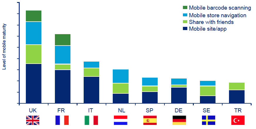 Webshops scoren over de gehele linie niet sterk op mobile commerce. Met name het Verenigd Koninkrijk loopt hier sterk voorop, Frankrijk in mindere mate. Nederland is een middenmotor, maar scoort opvallend beneden peil als het gaat om een mobile site of app. Dit is waarschijnlijk te danken aan de hoge penetratie van desktops, waardoor het belang van een mobiele site vaak wordt onderschat.