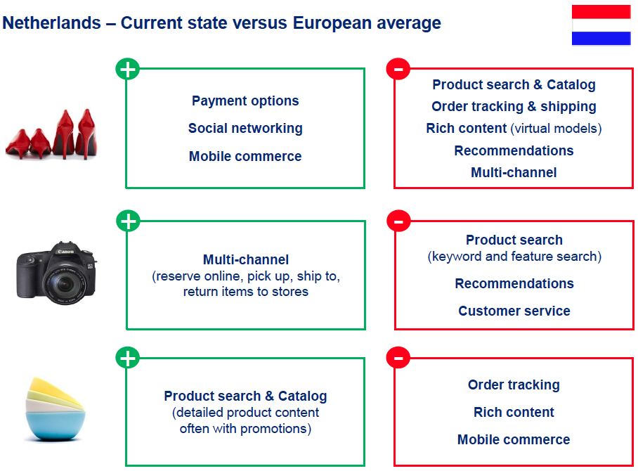 Nederlandse webshops hebben weinig zogeheten extended features, zo concludeert Deloitte. Zuid-Europa verslaat Noord-Europa op de meeste capabilities (qua online maturity van consumenten geldt het omgekeerde). Opvallend is dat Nederlandse webshops vooral slecht scoren op social media. Frankrijk, Italië & Turkije zijn het sterkst in integratie met Social networks. Multi-channel ondersteuning is voor webshops de grootste uitdaging, maar Nederland scoort hier gemiddeld goed op, vooral in de electronica sector.