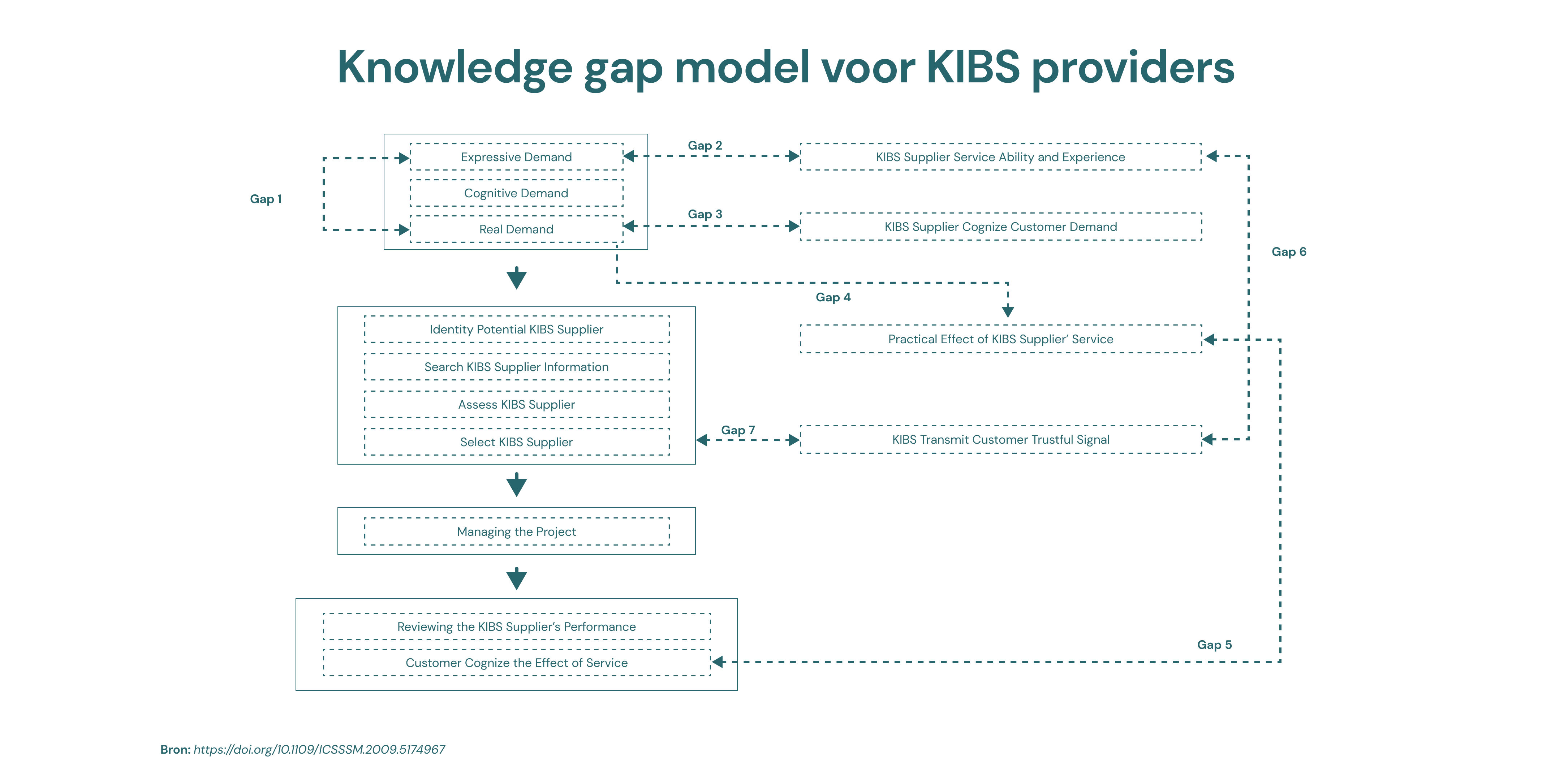- Failure to understand ‘real’ demands:Het gebeurt ook dat KIBS providers de daadwerkelijke behoeften van de doelgroep niet begrijpen. Dit kan ontstaan doordat de doelgroep zelf onvoldoende op de hoogte is van wat ze nodig hebben, en hierdoor verkeerde signalen afgeven, of door een gebrek aan inzicht in de markt en kennis over wat er onder de doelgroep speelt.
